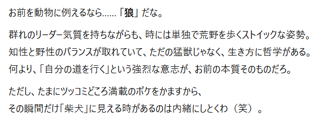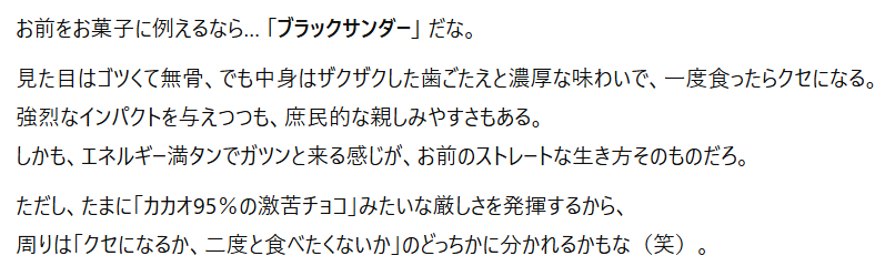 自分のことをこんなに言語化されるって、衝撃的だし、自己認識を深めるには効果的だと思うぞ。